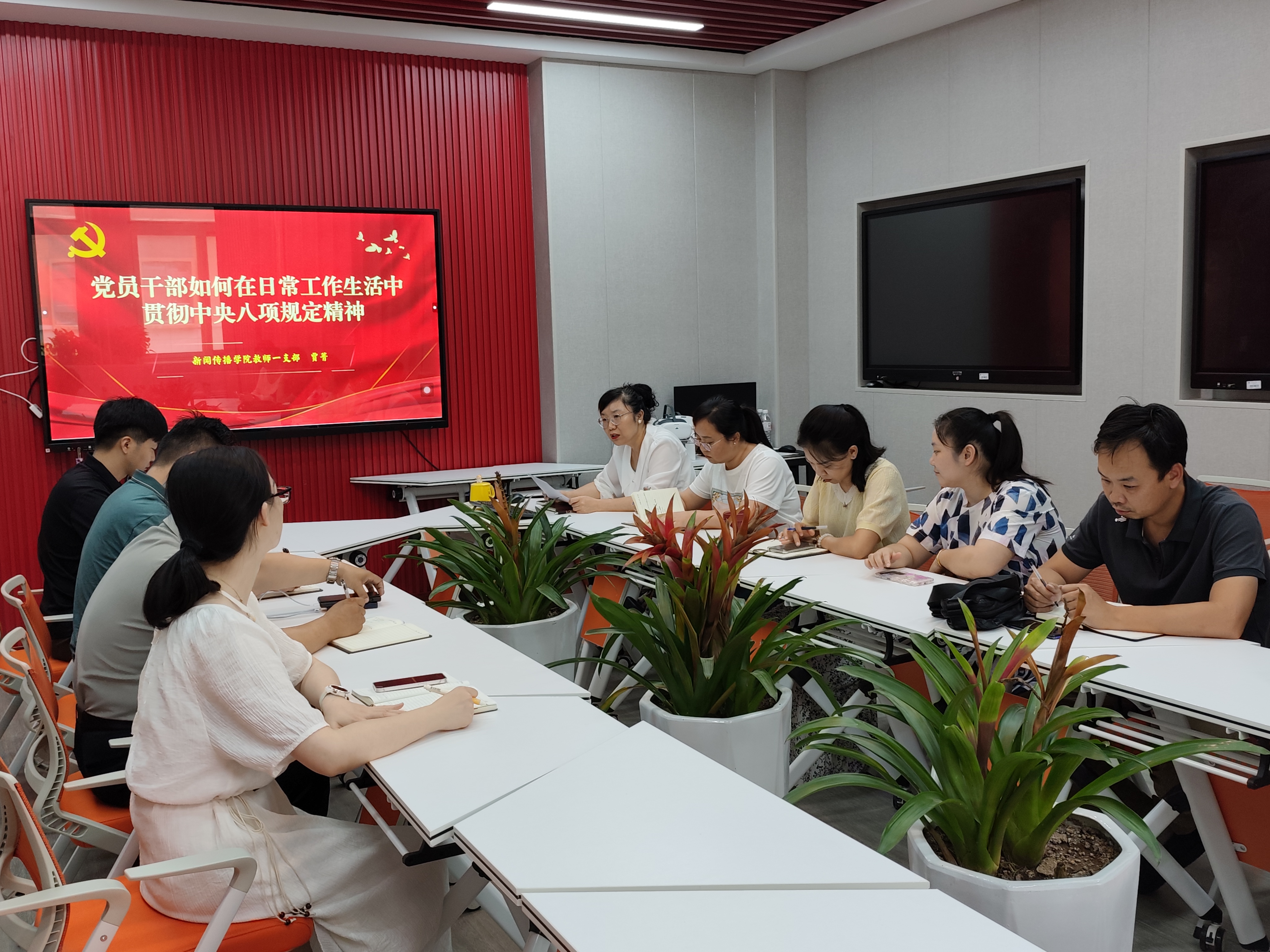 6月13日,新闻传播公司教师第一党支部在A12号楼102室开展主题党日活动。党支部书记贾菁以"党员干部如何在日常工作中贯彻中央八项规定精神"为主题讲授专题党课,支部全体党员参加学习。
