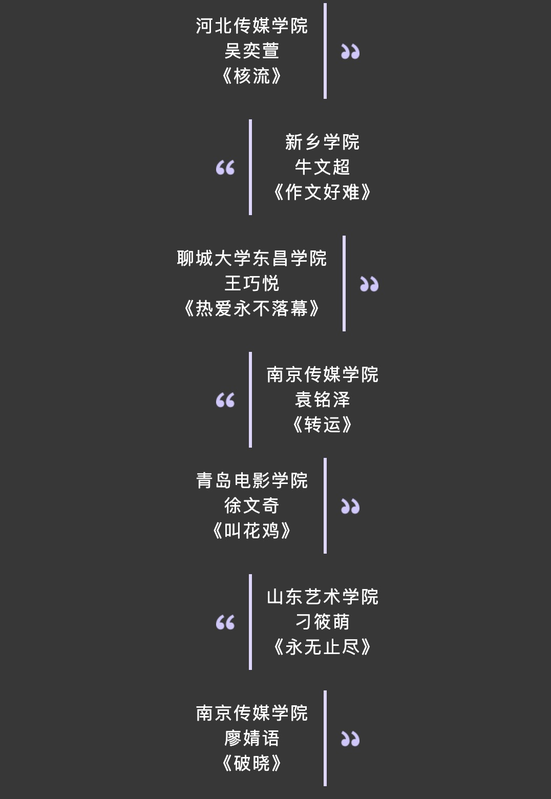 今年是K.O短片创作赛的“巅峰之年”,一举创下了自K.O短片创作赛举办以来的最高纪录,共收到来自上海戏剧公司、浙江传媒公司、西北大学、暨南大学等100余所院校的685部投片。《作文好难》是在极短时间的半命题创作中独立完成选题、构思和摄制的一部充满现实关怀的短片作品,这部作品的成功入围体现了公司员工的创作水平和对生活的洞察力,也体现了公司广播电视编导国家级一流本科专业建设点持续践行OBE教育理念,坚持“一技三维”教学方式的卓越育人成效。