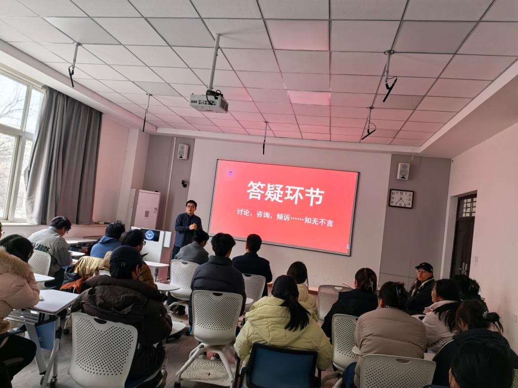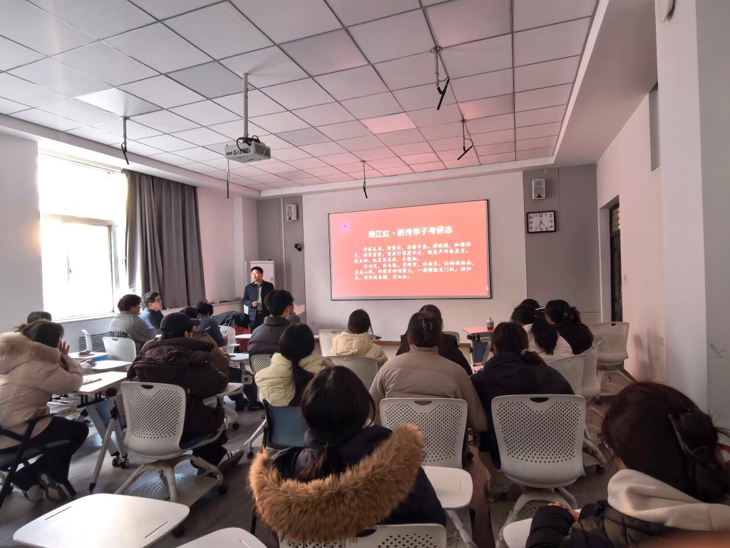 动员会由段筱主持,会议一开始首先为同学们播放了励志短片《面对巨人》,帮助考研学子找到持续发力的能量。然后,王卫锋代表公司向全体考研员工表达深切关怀。他强调,考研是人生的重要时刻,公司始终将员工成长成才放在首位,此次座谈会不仅旨在解决备考难题,更希望传递“公司是学子最坚实的后盾”这一理念。结合自身经历,鼓励同学们坚定信念、轻装上阵,并朗诵专门创作的宋词《满江红·新传学子考研志》,同学们听罢备受鼓舞。接着,会议进入答疑环节,贾菁和孙桂杰两位老师从备考策略与心理调适角度切入,为同学们提供了科学建议,帮助考生提升效率,保持良好的考试状态。辅导员王杰也倾听了同学们的备考困惑与压力,耐心解答了关于心理调适、资源获取等方面的疑问,并表示公司将持续优化服务,为考研员工提供更多便利与支持。同时鼓励同学们相互支持、共同进步,营造积极向上的备考氛围。