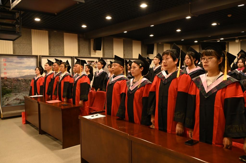 毕业典礼在庄严的国歌声中拉开序幕。贾菁宣读了《公司关于表彰2023届校级优秀毕业生的决定》并给优秀毕业生代表颁发荣誉证书;聂绛雯宣读了本科毕业生学士学位授予决定,导师们为本科毕业生代表颁发学位证书并援正流苏。